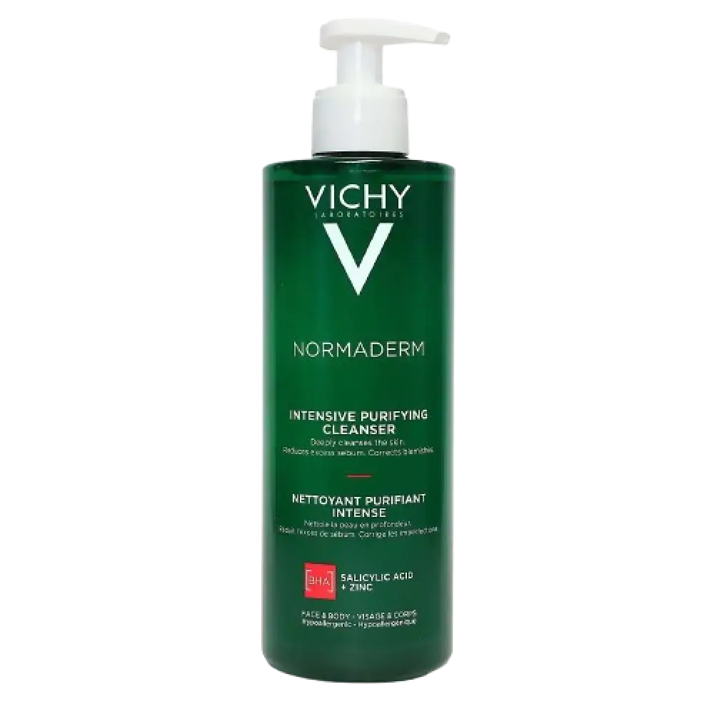 🧼 جل التنظيف المكثف نورماديرم من فيتشي – 400 مل جل منظف علاجي مخصص للبشرة الدهنية والمعرضة لحب الشباب، يحتوي على تركيبة فعالة من حمض الساليسيليك، الزنك، والنحاس، بالإضافة إلى البروبيوتيك النباتي. يُستخدم لتنظيف المسام بعمق، إزالة الأوساخ والدهون الزائدة، وتقليل مظهر الرؤوس السوداء والمسام الواسعة. يُحافظ على توازن الحموضة (pH 5.5)، ويمنح البشرة إحساسًا بالنقاء والانتعاش دون التسبب بجفاف أو تهيج. مناسب للبشرة الحساسة، ويُستخدم صباحًا ومساءً على بشرة مبللة.